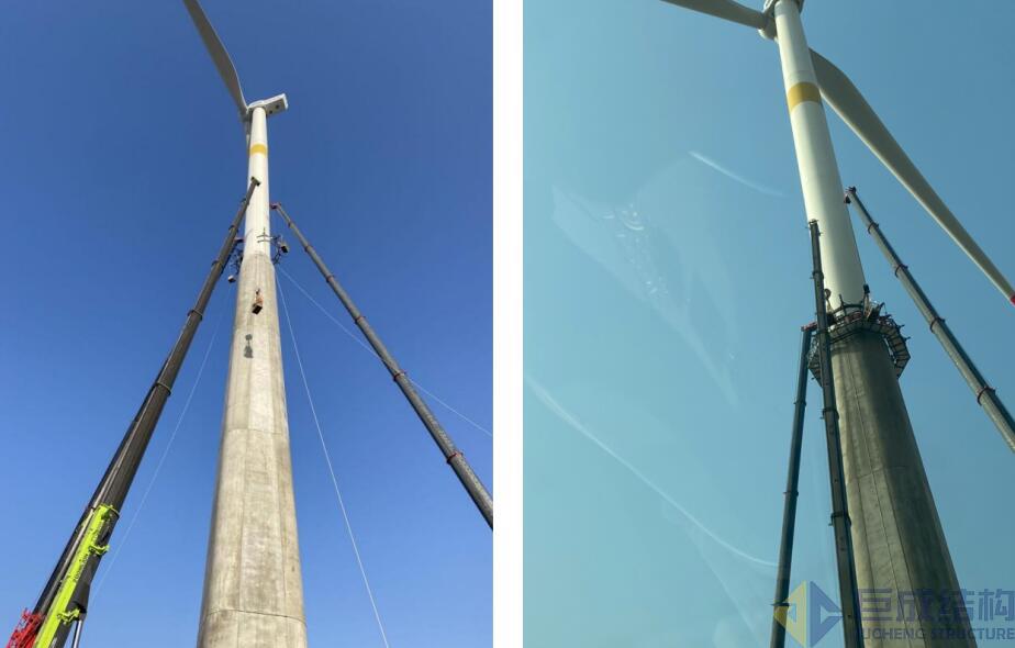 2021年初的寒潮相比往年更猛烈,巨成結(jié)構(gòu)位于山東鄄城的施工場地達到零下18℃,滴水成冰,而疫情又在河北復(fù)燃。鄄城項目風(fēng)機塔筒采用預(yù)應(yīng)力混凝土與鋼筒結(jié)合的組合結(jié)構(gòu)形式,總高度140m,該創(chuàng)新體系在國內(nèi)是首次使用,因此它的安全使用對于業(yè)主和行業(yè)的發(fā)展都有重要意義。巨成的任務(wù)是在春節(jié)前完成兩個風(fēng)機塔筒加固。