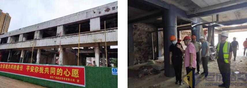 2021年6月25日,十堰市“6.13事故”指揮部邀請巨成結(jié)構(gòu)專家前往十堰對部分受損建筑進行研判。巨成立即組織由周劍波教授、廖杰洪博士、王小兵工程師組成的專家組趕往十堰。在聽取情況介紹和現(xiàn)場踏勘后,巨成專家組給出了安全、高效的加固方案。業(yè)主方對專家組中肯、可行的方案表示肯定。經(jīng)指揮部向十堰市委市政府匯報,由巨成結(jié)構(gòu)對離爆炸點最近的兩棟房屋進行應(yīng)急加固搶險。