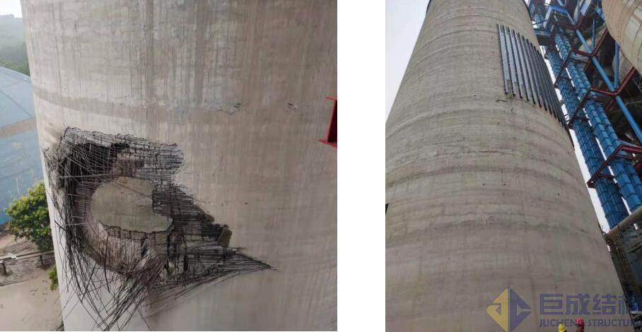 2021年8月23日凌晨,巨成公司接到老河口水泥廠的緊急求援電話,公司立即由總工周劍波教授帶隊赴現(xiàn)場踏勘。生料庫直徑24m,高度60m,在25m附近出現(xiàn)一個高寬10余米的破損洞口。