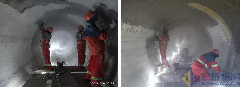 該段供水管道直徑2.6m,為玻璃鋼夾砂材質(zhì),曾多次發(fā)生爆管,巨成針對玻璃鋼夾砂管的特點開展試驗研究,提出了粘貼碳纖維布的加固方案。從歷次檢修結(jié)果發(fā)現(xiàn),該方案起到了很好的加固效果,降低了爆管的風(fēng)險,發(fā)生爆管的管節(jié)主要出現(xiàn)在沒有加固過的區(qū)域,獲得了業(yè)主方一致肯定.